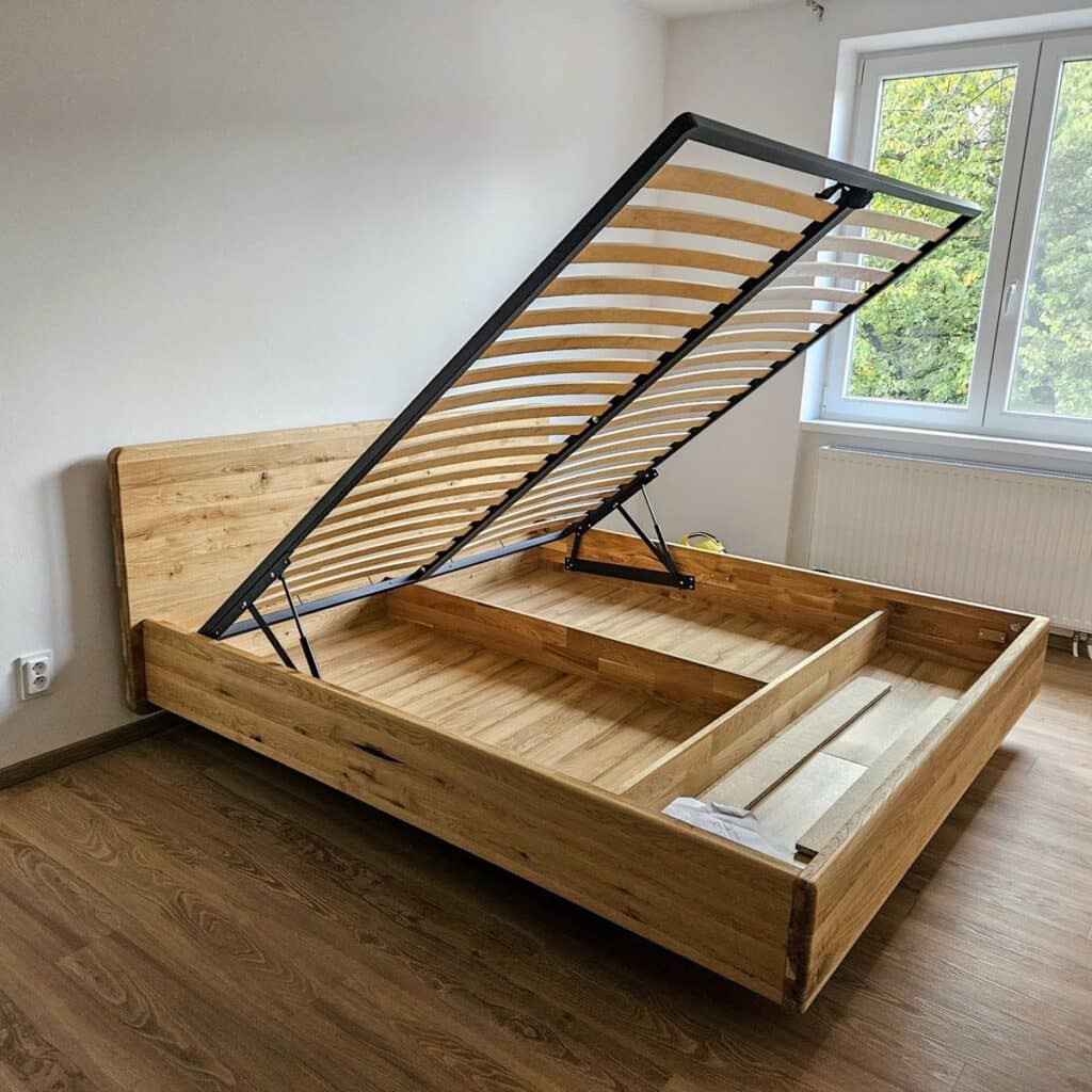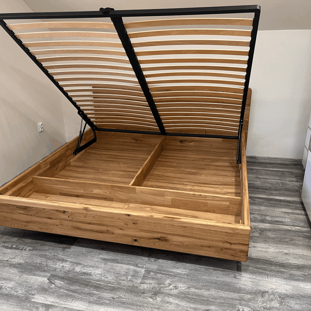Kromě toho, že je manželská postel Pavla vysoce odolným kusem nábytku, skrývá také úložný prostor. K úložnému prostoru se dostanete zvednutím vyklápějícího roštu, který zůstane držet nahoře díky plynovým pístům. Nemusíte se proto obávat, že na vás rošt spadne. Dubové dřevo je ošetřeno olejem italské značky Sigmar Vernici.