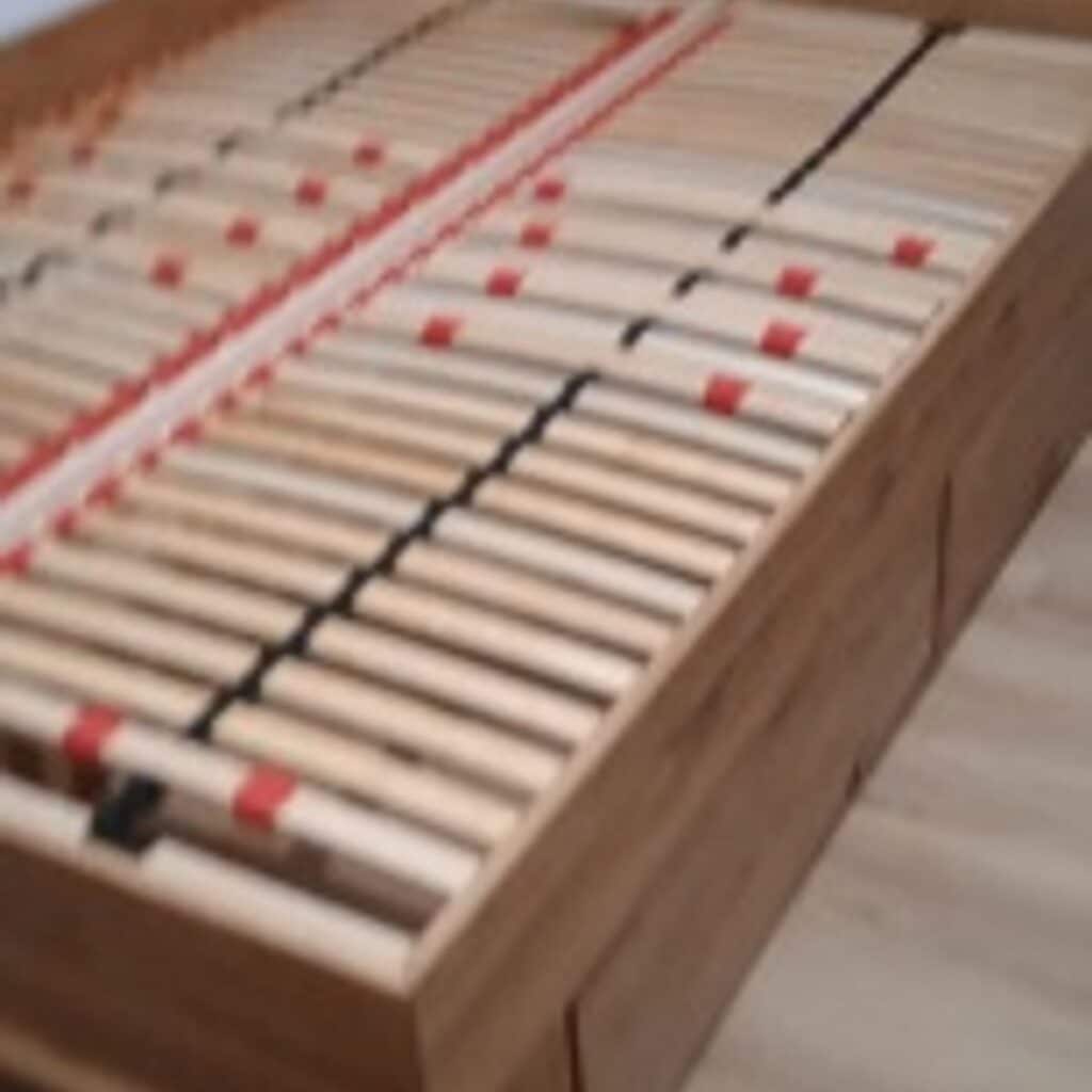 Postel je velmi pěkná a kvalitně provedená. I při tloušťce desek 18mm je díky dubu dostatečně pevná. Trochu slabší místo je středový nosník z měkkého dřeva, zejména ve spojení se šuplíky, které mohou narážet do podpěr nosníku (jsou dvě).