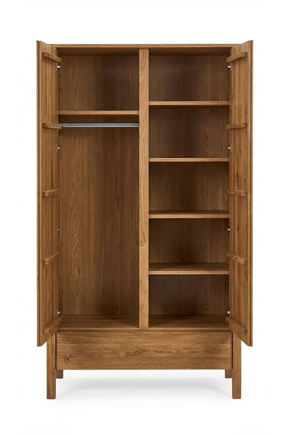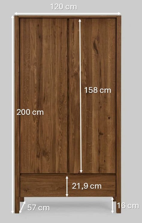 Dvoje vysoké dveře umožňují pohodlný přístup do celé skříně, přičemž její masivní konstrukce působí stabilně a odolně.
