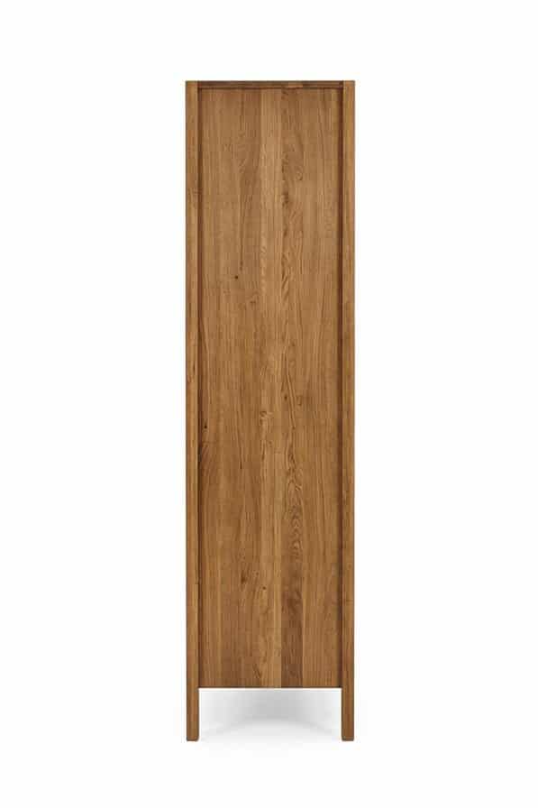 Jednoduché a čisté linie nechávají vyniknout krásu dubového dřeva. Přirozené suky a struktura dřeva dodávají každému kusu osobitý charakter. Skříň stojí na vysokých masivních nohách, které zjemňují celkový vzhled a zároveň usnadňují úklid pod nábytkem. Součástí je bezúchytkový design, dvířka se otevírají pomocí elegantně vyfrézovaných drážek.