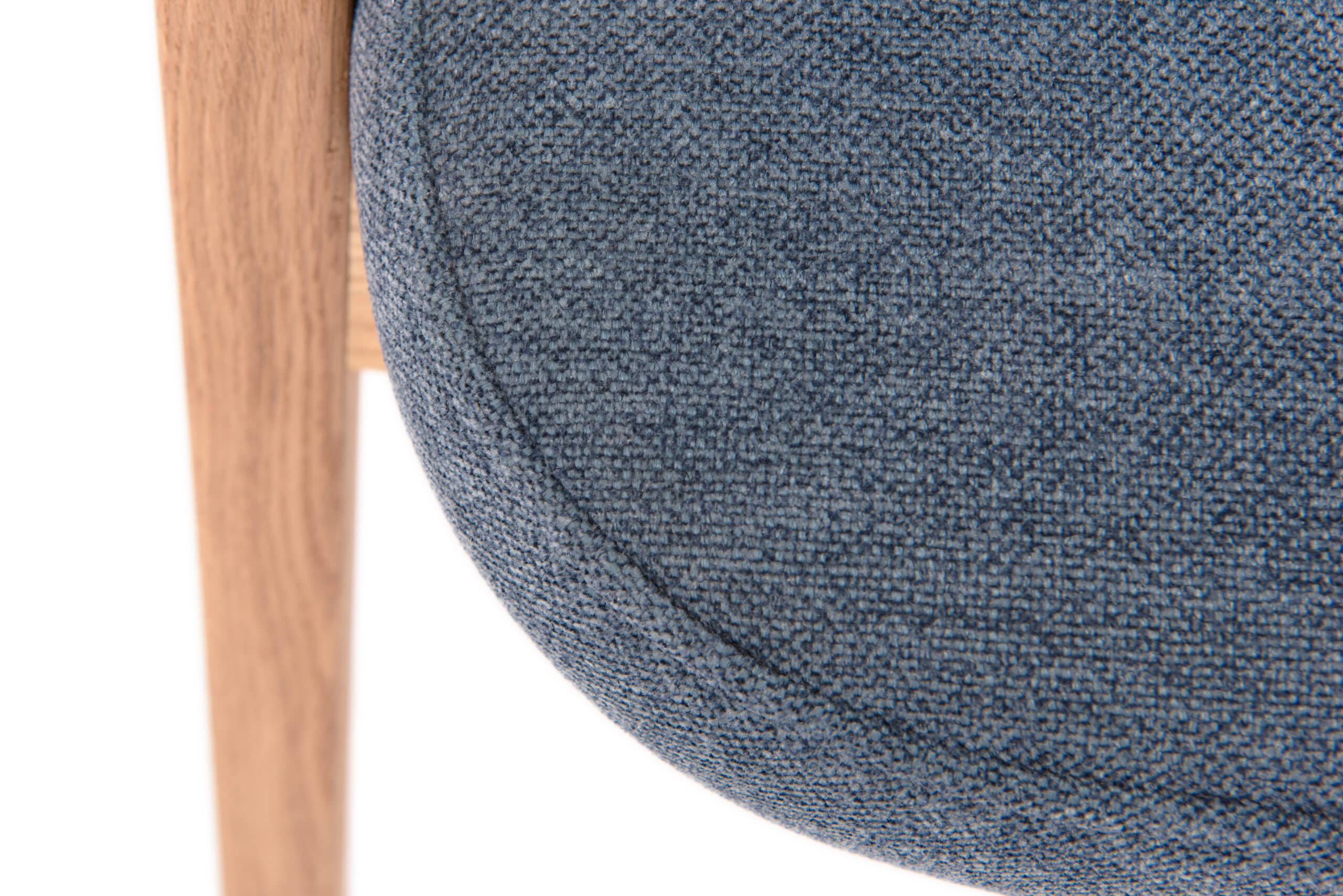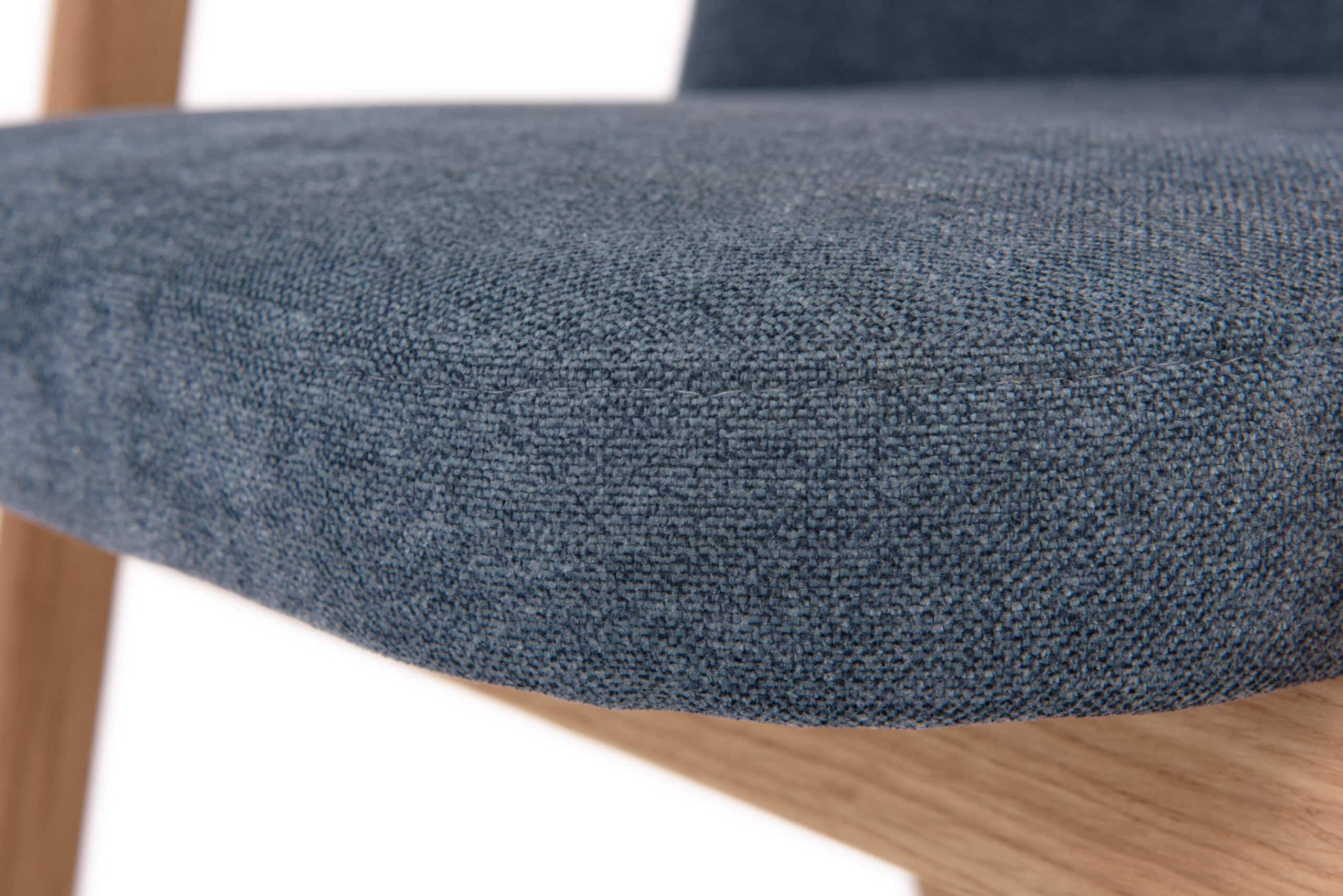 Výrazným prvkem je modré polstrování, které židli dodává svěží a elegantní vzhled. Příjemná potahová látka je měkká na dotek, odolná při každodenním používání a vytváří útulný dojem. Tlumený modrý odstín se snadno kombinuje s přírodními materiály i moderním vybavením domácnosti.