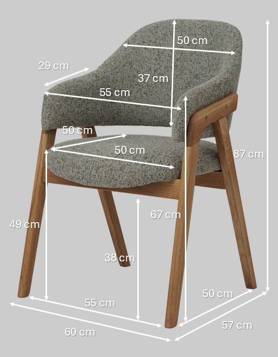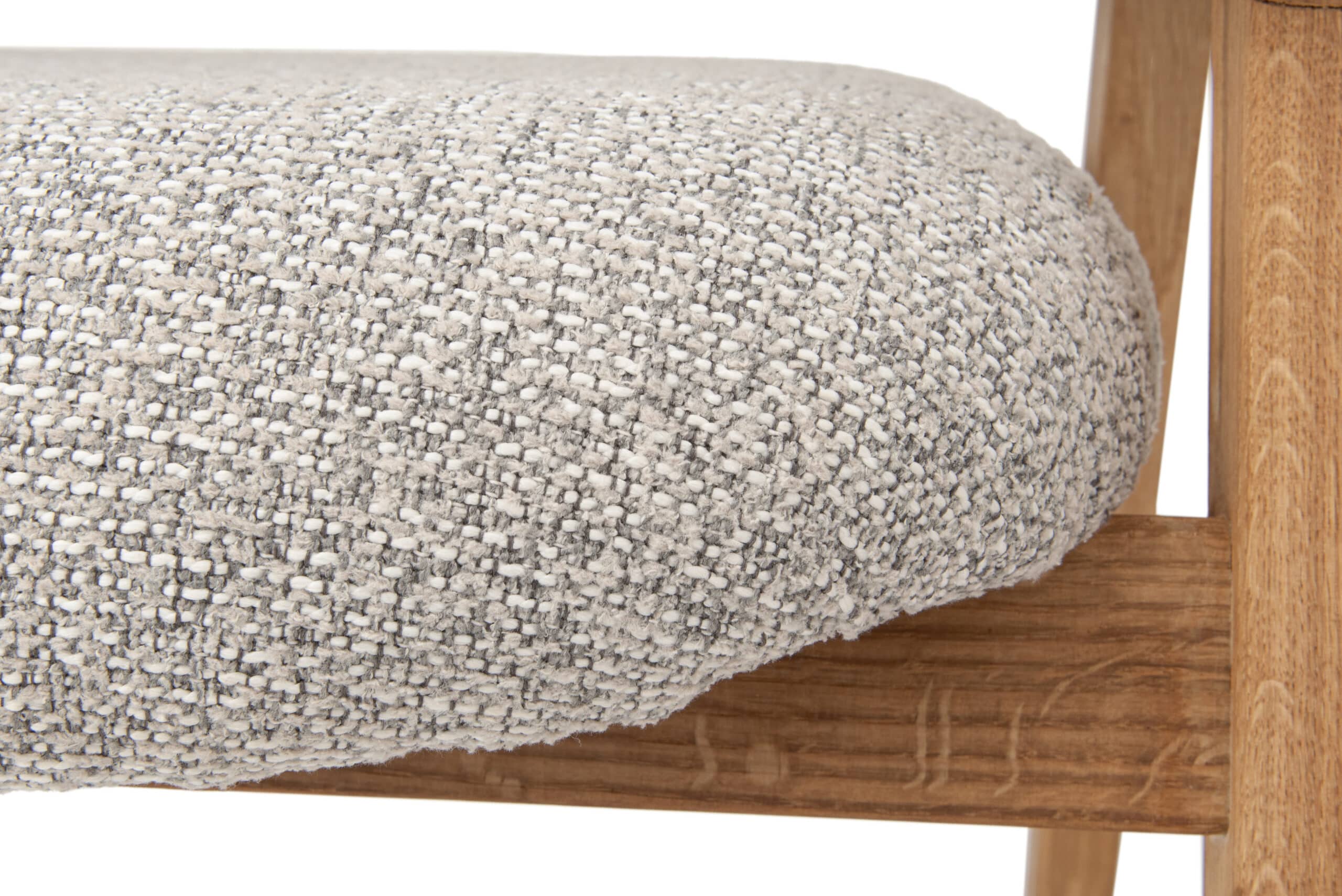 Stabilní konstrukce z masivního dubového dřeva, ošetřeného přírodním olejem, zajišťuje dlouhou životnost a vysokou odolnost křesílka. Použité materiály jsou pečlivě vybírány s důrazem na kvalitu, pevnost a přirozený vzhled. Spojení masivního dřeva a výrazně strukturovaného textilního potahu vytváří harmonický celek, který obstojí jak po funkční, tak po estetické stránce a podtrhuje moderní skandinávský charakter křesílka.