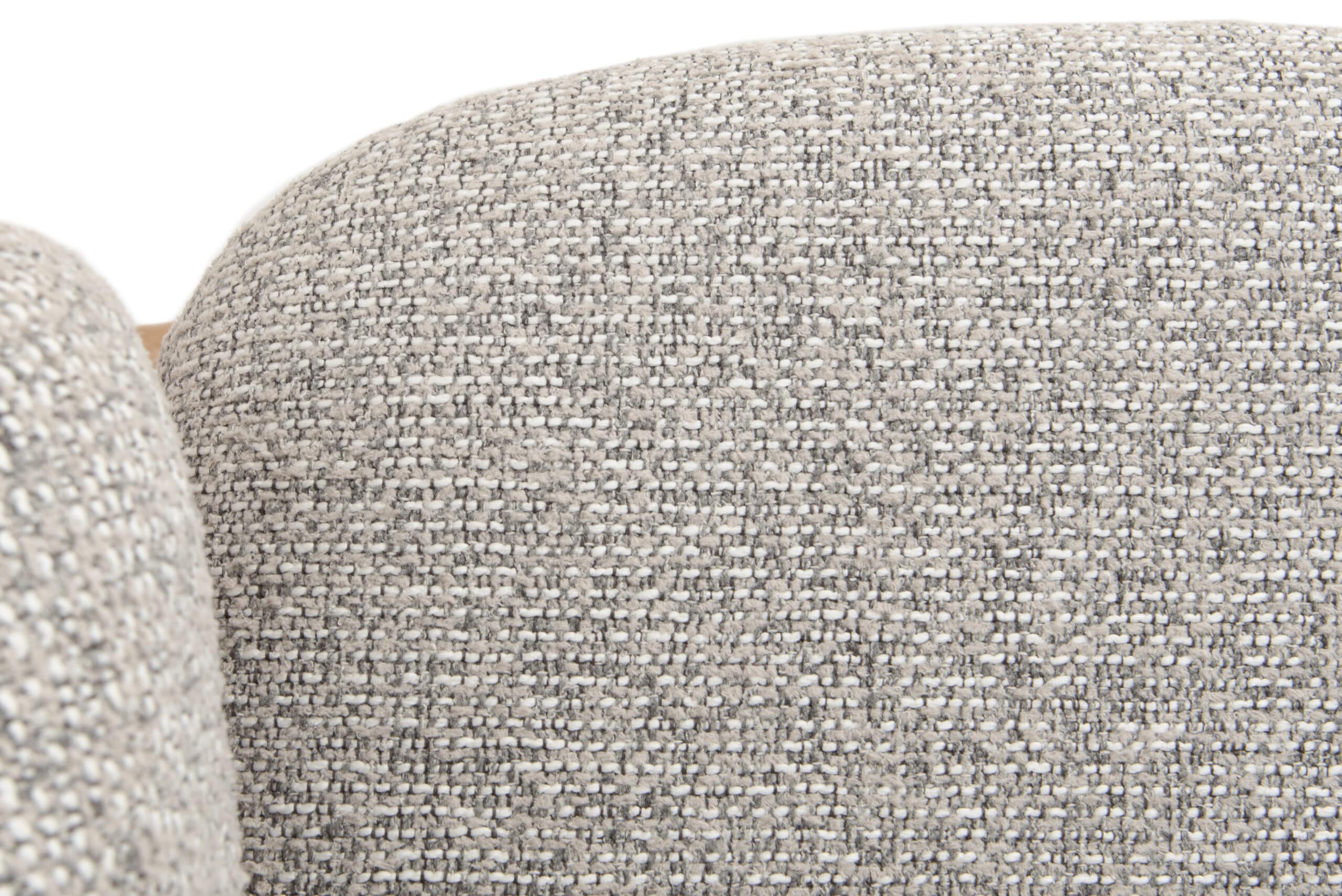 Potah křesílka je vyroben z výrazně strukturované tkaniny s tkanou texturou, ve které se prolínají jednotlivé odstíny světle šedé doplněné jemnou antracitovou nití. Tato kombinace dodává látce hloubku a jemný vizuální kontrast. Na pohled i na dotek je potah velmi příjemný, působí měkce, útulně a přirozeně, přitom si zachovává odolnost a nadčasový charakter.