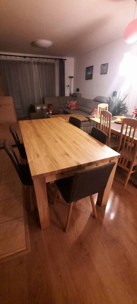 Nádherný bytelný stůl, s jehož váhou měli dva co dělat. Krásné čisté provedení, ten tu s námi bude generace 🙂
