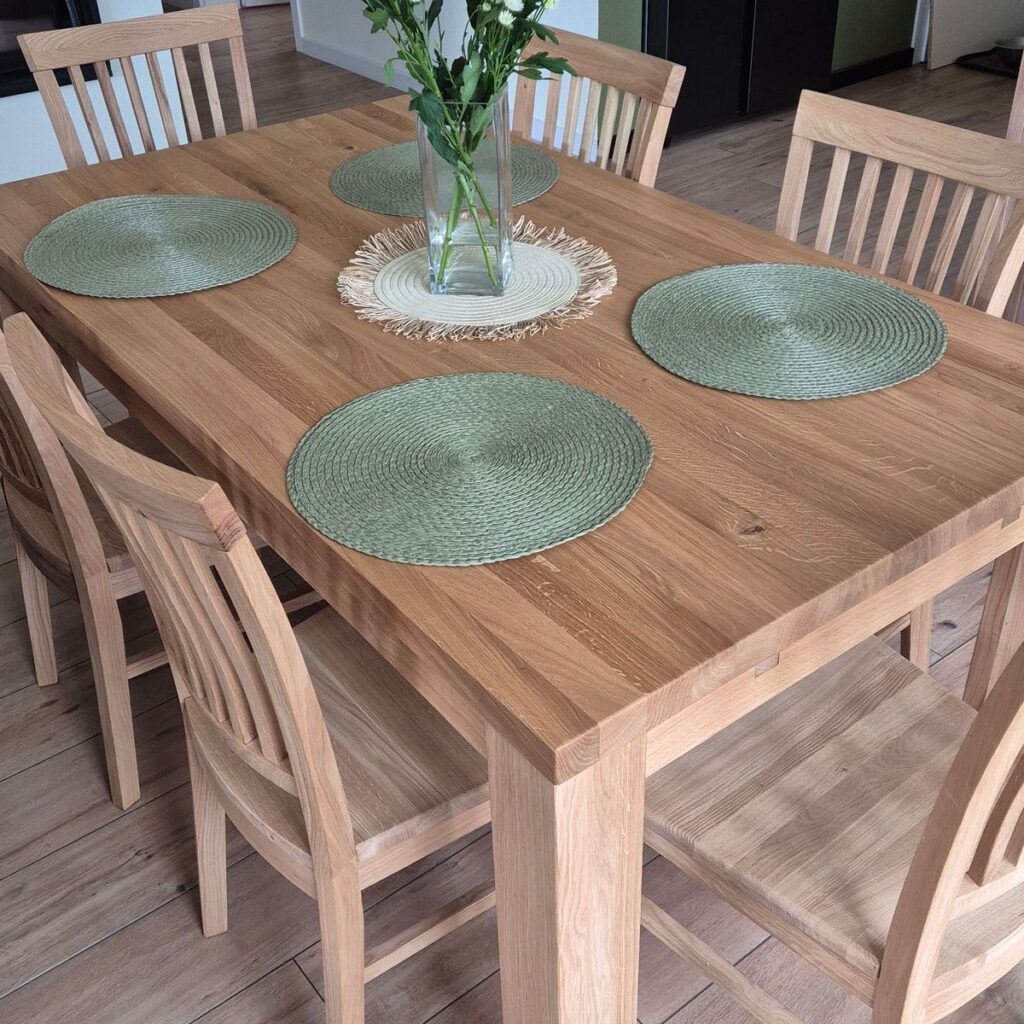 Opravdu krásný dubový stůl, precizní zpracování, silné nohy, které jsou umístěny až na kraji a proto je více místa na zasunutí židlí, silná 4 cm deska, bytelná konstrukce