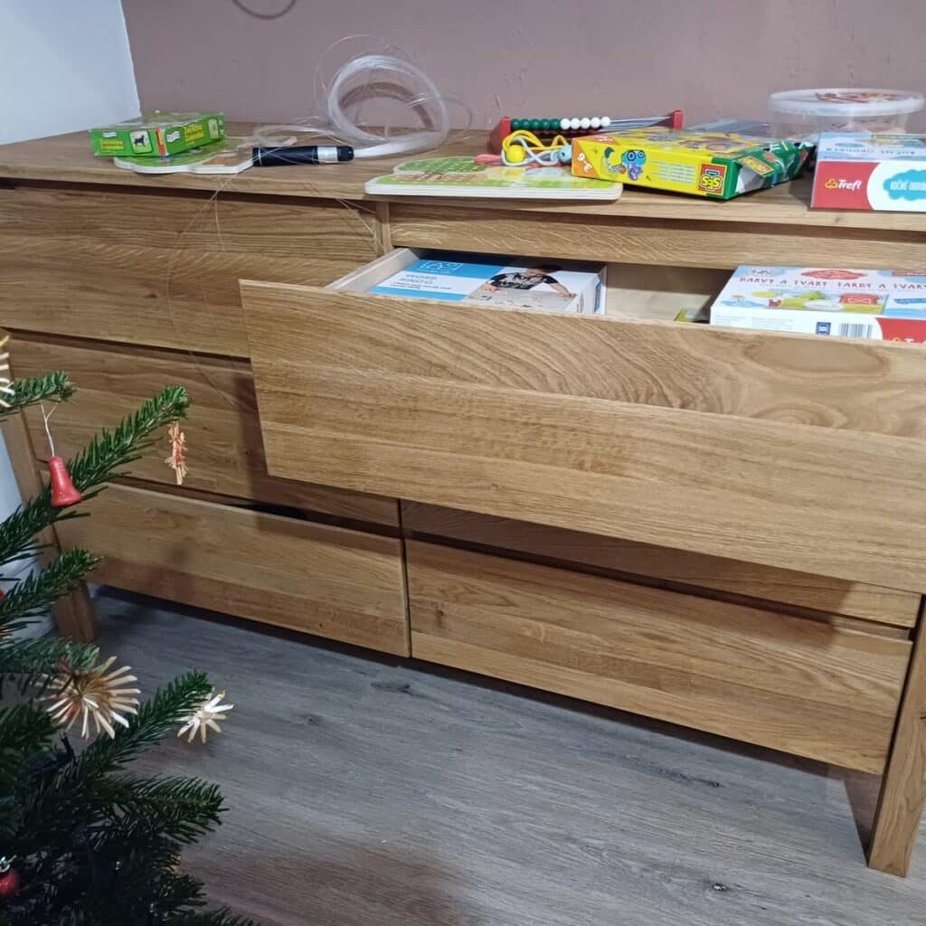 Masivní dřevěná komoda nabízí šest prostorných zásuvek, které poskytují dostatek místa pro uložení oblečení, textilií či drobných předmětů. Zásuvky jsou vybaveny systémem soft close, jenž zajišťuje tiché a plynulé dovírání. Pojezdy umístěné na spodní straně zásuvek přispívají k elegantnímu vzhledu a hladkému chodu při každodenním používání.