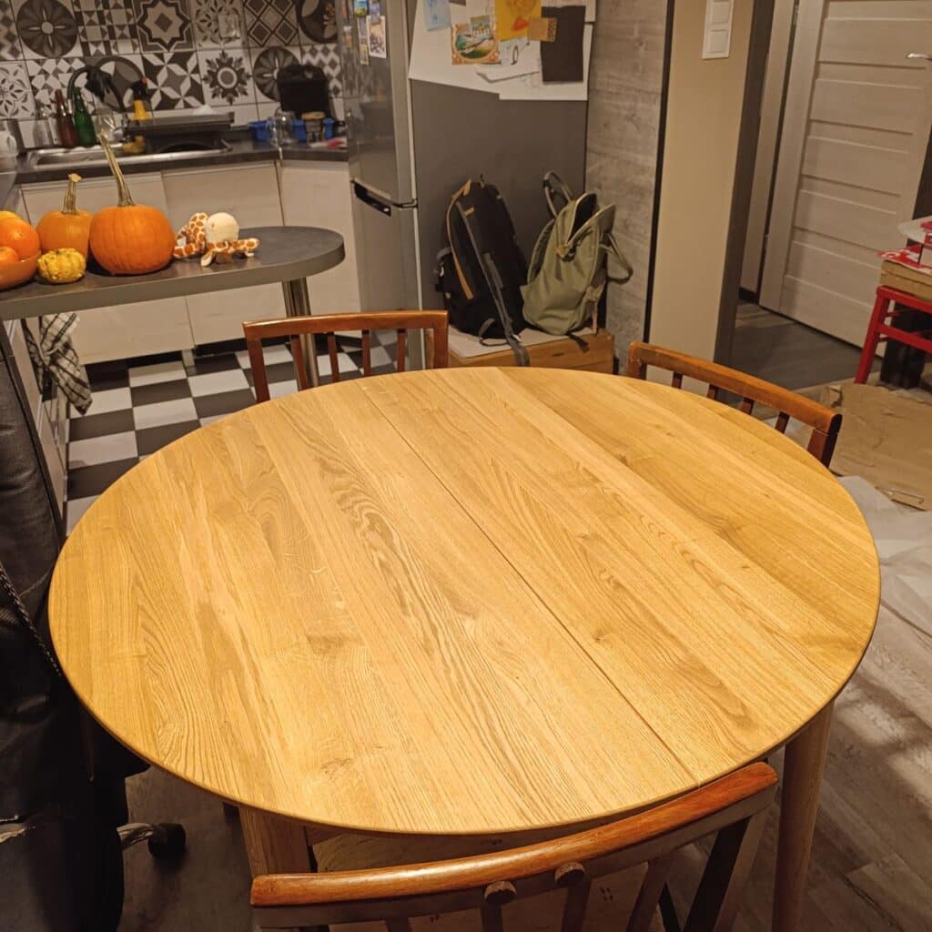 Deska z masivního dubu je ošetřena olejovo-voskovou úpravou, která zvýrazňuje dřevo a chrání povrch. Pro zachování krásy a ochrany je potřeba povrch jednou za čas obnovit přípravky určenými na olejovaný nábytek. Pro každodenní používání je důležité chránit desku před vlhkostí a teplem – vždy používejte podložky pod horké nebo mokré předměty. Přímý kontakt může způsobit skvrny, změnu barvy nebo narušení povrchu. Desku čistěte jemně navlhčeným hadříkem a ihned osušte, vyhněte se agresivním čisticím prostředkům.