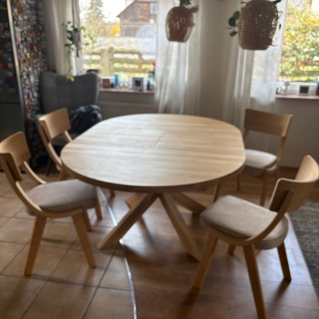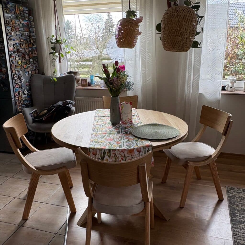 Nábytek dorazil za několik dní, zabalený na paletě. Sestavení stolu proběhlo poměrně rychle podle návodu na internetu (video z přiloženého QR kódu). Stůl vypadá kvalitně, židle jsou pohodlné a docela dobře vyrobené. Pouze jedna židle (model Alexis) má o něco tmavší odstín dřeva, ale není to velký rozdíl.