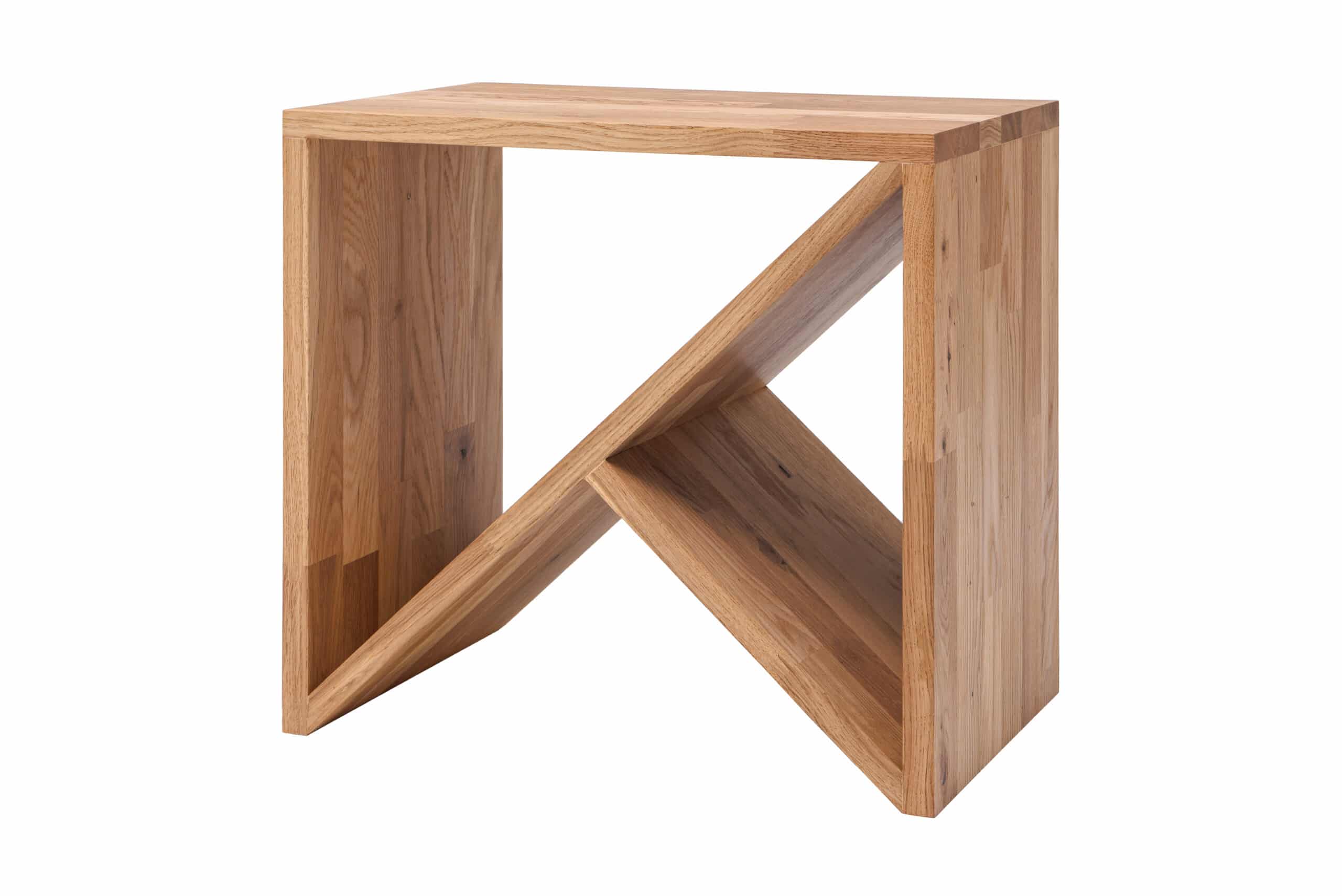 Stolek zaujme svým minimalistickým pojetím s netradičně řešeným odkládacím prostorem. Dvě šikmé vnitřní police tvoří efektní křížení, které je nejen estetickým detailem, ale zároveň praktickým místem pro knihy, časopisy či dekorace. Robustní rám z masivního dubu podtrhuje stabilitu a nadčasový charakter celého kusu.