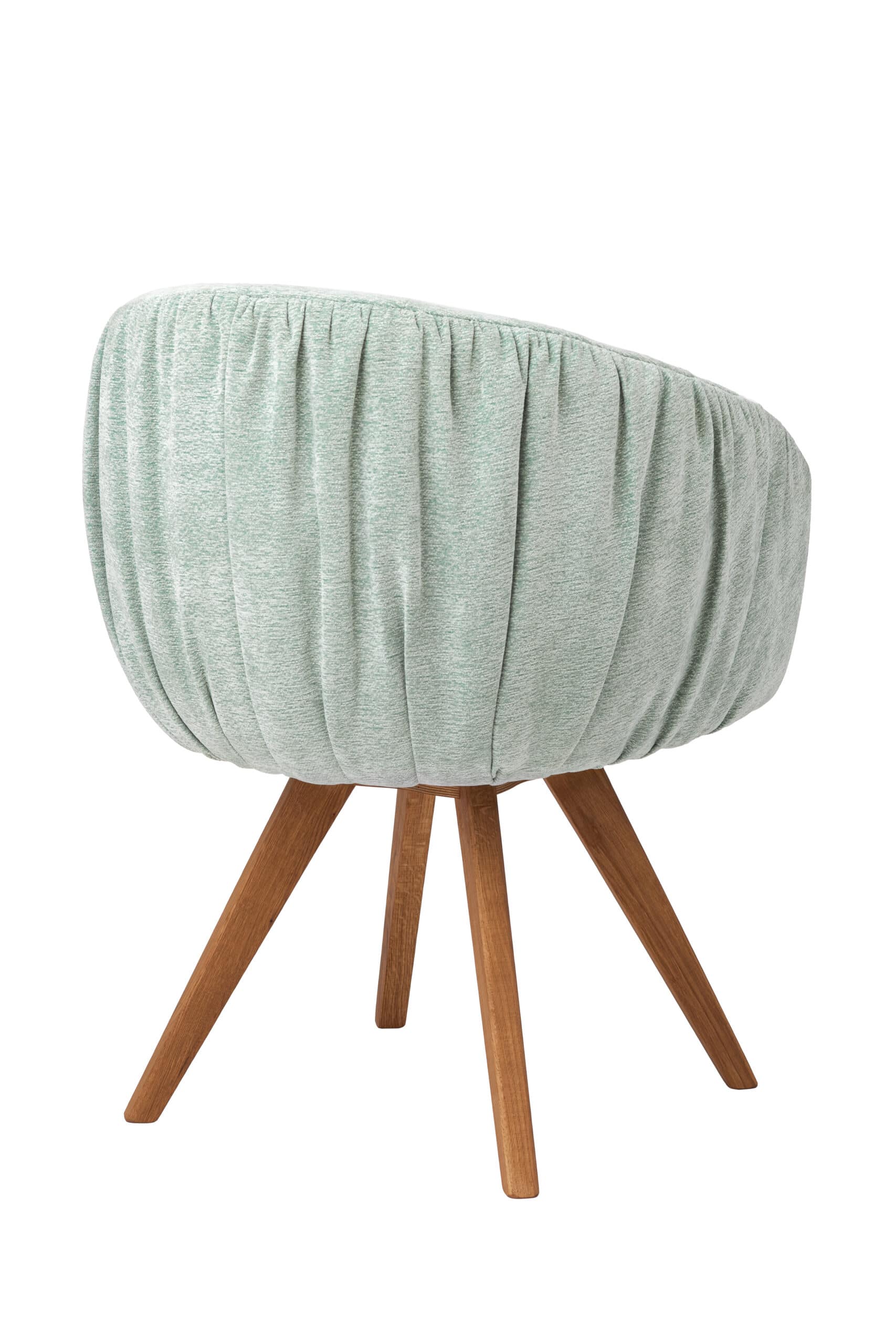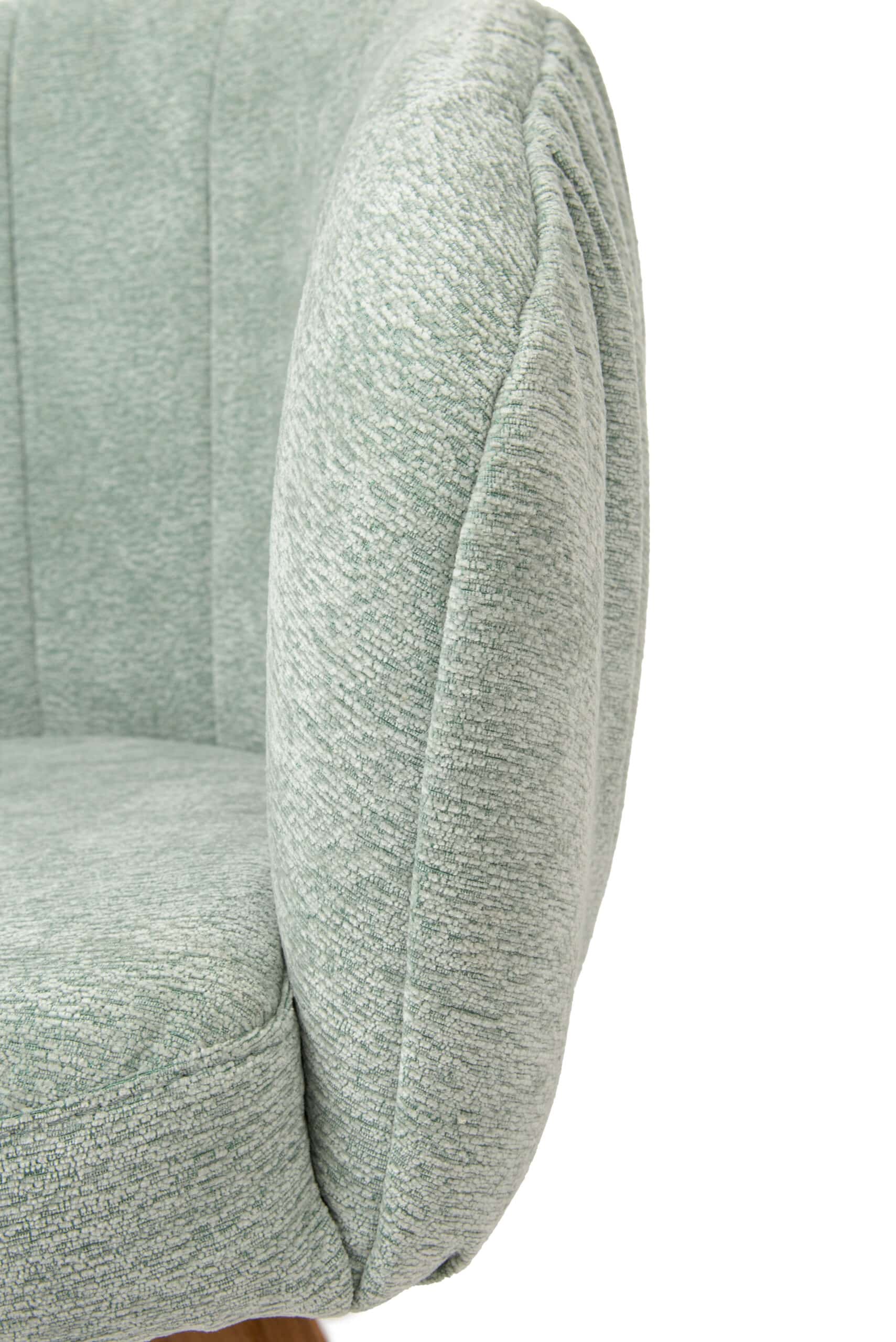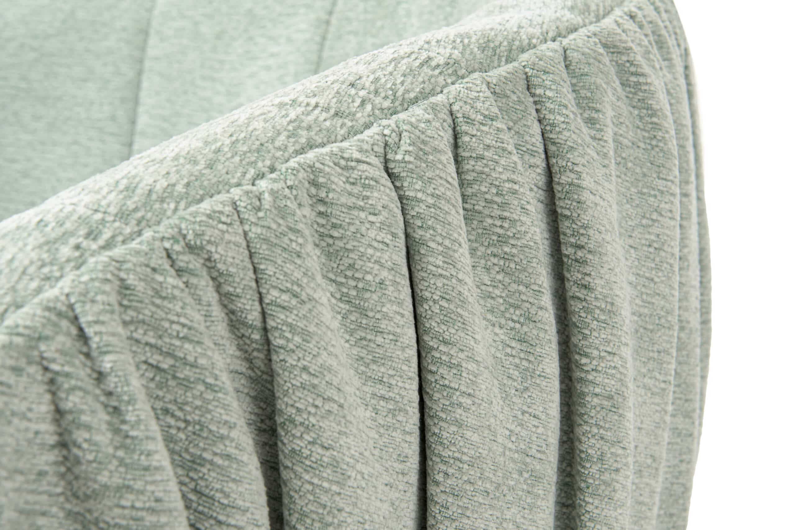 Sedák i opěrka jsou bohatě polstrované a potažené kvalitní strukturovanou látkou v mátově zeleném odstínu. Tento svěží tón působí klidně a vzdušně, zároveň však zachovává elegantní a sofistikovaný dojem. Textilie má jemně tkanou strukturu, je příjemná na dotek, měkká a zároveň odolná vůči každodennímu používání. Opěradlo a boky jsou členěny svislým prošíváním do pravidelných polí, které křeslu dodává výrazný dekorativní rytmus a zároveň podtrhuje jeho tvar. Vnější strana je opatřena bohatě řaseným čalouněním, jež přináší pocit měkkosti a jemný nádech retro elegance.
