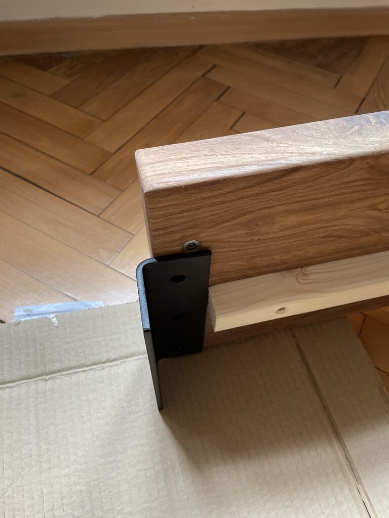 Postel z dubu a oceli, má snad 100 kg 🙂 Vypadá velice bytelně, bočnice se ani nehnou, když si ne ně sednu (mám 100kg), povrchová úprava oceli je ok (nejspíše prášková barva), dub má někde vady povrchu, mě se ale takové drobnosti spíše líbí a nepovažuji je za problém. Na nízkém čele jsou předvrtané otvory pro kování výztužné latě středem postele a jsou vyvrtány špatně, bylo nutno rozměřit a předvrtat nově (bez předvrtání není šance do dřeva dostat vrut). Návod je mizerný a neintuitivní, ty špatně vyvrtané otvory byly možná proto, že jsem nízké čelo dal opačně. Nikde o tom není zmínka, čelo je zcela symetrické a jediný rozdíl je v umístění otvorů pro kování – s rozdílem 1cm (okem nepoznáte). Nechtělo se mi rozdělávat brutálně sešroubované bočnice, převrtání bylo snadnější. Nakonec je postel sestavena, dát na ní pásy, byl by to tank 🙂 Nejspíše přežije nejen mě…